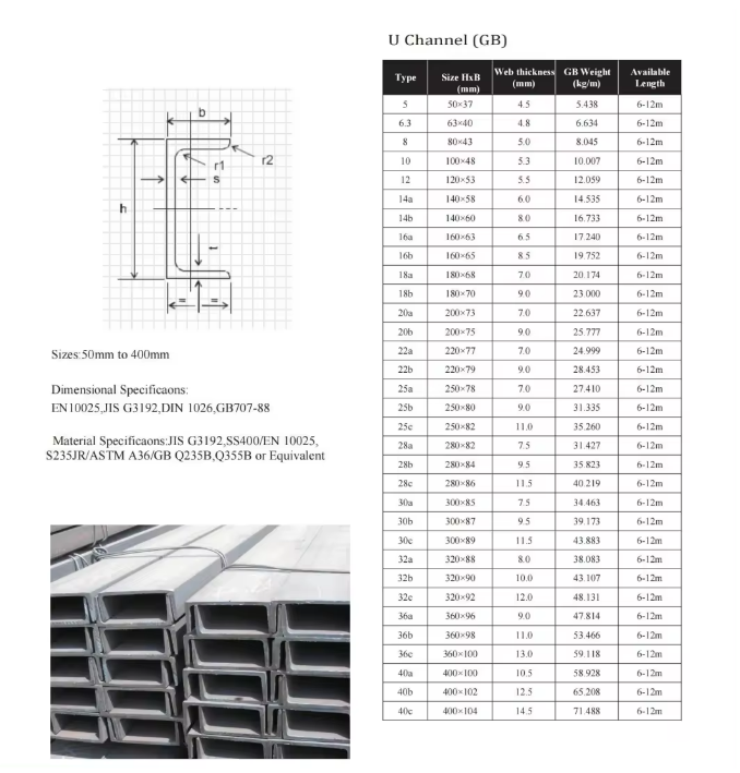 Introduction:U-shaped steel is a type of steel with a specific cross-sectional shape ,The cross-section of U-shaped steel is U-shaped, which has good load-bearing capacity and stability, and is suitable for withstanding vertical and horizontal forces.